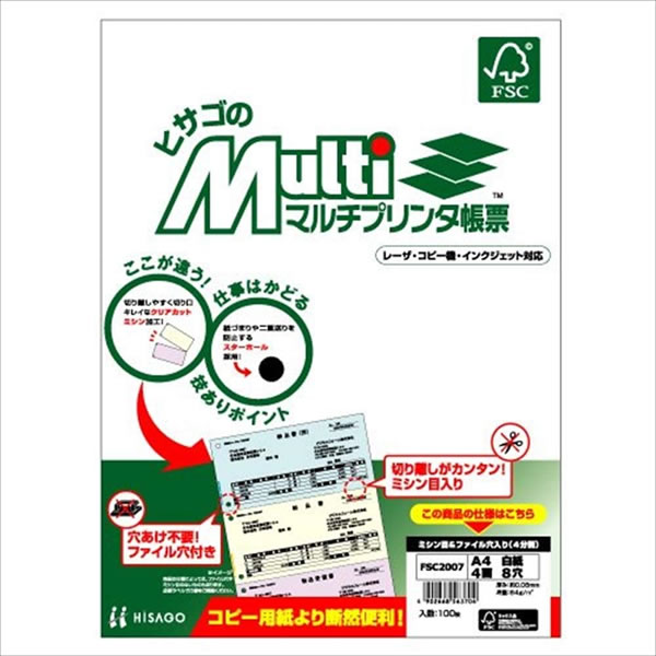 FSC(R)認証 マルチプリンタ帳票 A4 白紙 4面 8穴 FSC(R)認証材を使用したプリンタを選ばないマルチタイプの汎用帳票用紙です。 無地タイプなので使いやすい設計で帳票を印刷できます。 ※FSCの森林認証は、森林が環境・社会・経済面での厳しい基準を満たして管理されていることを意味します。 その他の帳票はこちらから 入数 100枚 サイズ A4タテ 210×297mm ミシン目切り離し後のサイズ 105×148.5mm 面付け 4 紙厚 約0.08mm...[詳細を見る]