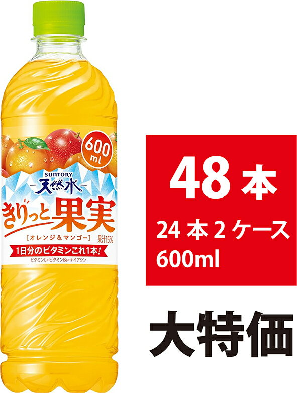 サントリー 天然水 きりっと果実 オレンジ&マンゴー 600ml 48本 24本×2ケース 1日分のビタミン ペットボトル 1日分のビタミンが補給でき、果実の栄養がすっきり飲める 600ml 48本(24本×2ケース)サントリー天然水から新提案!たっぷり果実の栄養がすっきり飲める果汁飲料。厳選したオレンジ・マンゴーの果汁と清冽なサントリー天然水を使って、果実の充実感はありながらも雑味を抑えた心地良い口あたりに仕上げました。1日分...[詳細を見る]