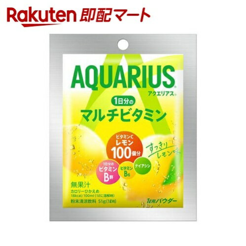 ★注目キャンペーン情報★ 商品情報商品詳細アクエリアス 1日分のマルチビタミン パウダー●後味すっきりレモンフレーバーで、1日分のマルチビタミンが水分補給と同時に手軽に摂れる粉末清涼飲料です。●1袋(51g)で1L分の「アクエリアス 1日分のマルチビタミン」をお楽しみいただけます。原材料糖類(砂糖(国内製造)、ぶどう糖)、食塩/ ビタミンC、クエン酸、クエン酸Na、香料、塩化K、乳酸Ca、ナイアシン、甘味料(アセスルファムK)...[詳細を見る]