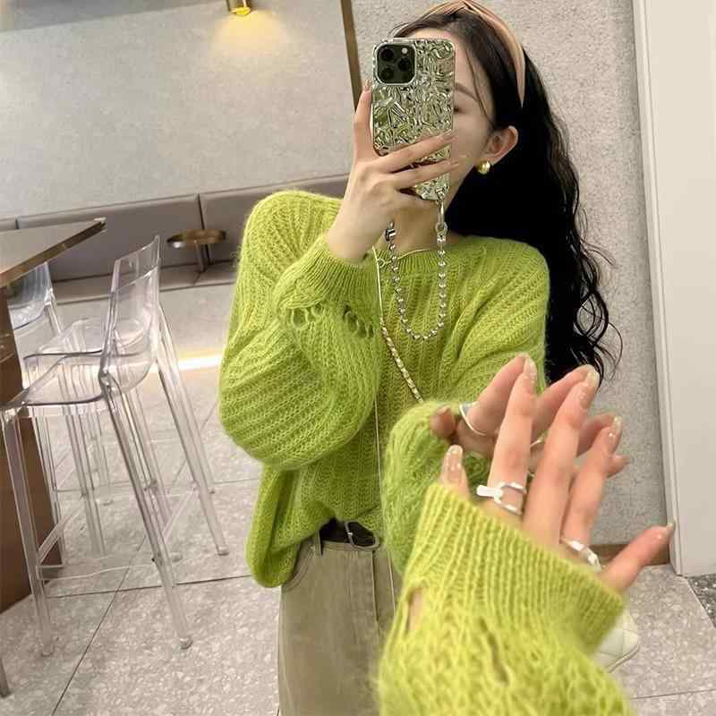 ニット レディース 春秋 長袖 デザイン ゆるかわ ラウンドネック プルオーバー トップス 接触冷感 伸縮性 無地 グリーン[詳細を見る]