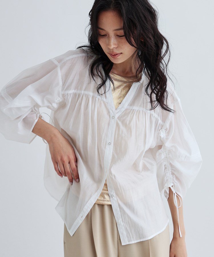 INDIVI(インディヴィ)袖シャーリングシアーローンブラウスDesignPoint軽やかで透け感のあるシアー素材を使用したブラウス。独特のシャーリングディテールが特徴で、袖口のリボンが可愛らしいアクセントになっています。洗練されたデザインがモード感を演出し、シンプルながらも存在感のある一枚です。StylingPointデニムやスラックスと合わせてカジュアルに、またはスカートと組み合わせてエレガントに。さまざまなスタイルに...[詳細を見る]