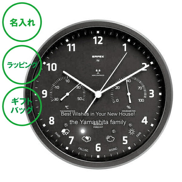 商品情報名入れカバーガラスの下部中央にメッセージが入ります。サイズサイズ : 約 Φ265 x D50 mm重量 : 約 760 g (電池含)ボックス : 約 275 x 275 x 60 mm材質材質 : PS 樹脂 (枠)温度計精度 : ±1℃ (0 - 40℃)湿度計精度 : ±2%RH (35 - 75%RH 常温)電源 : 単三乾電池 x 4保証期間 : 1年MADE IN JAPANカラーブラック注意事項※ 価格には基本的なレリーフが含まれております。※ イメージにはサンプルのメッセージが入っております...[詳細を見る]