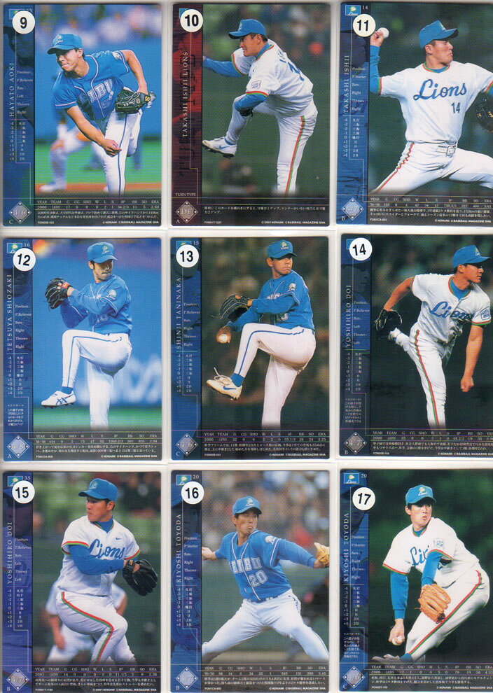 掲載カード(選手)…青木勇人 石井貴 潮崎哲也 谷中真二 土肥義弘 豊田清 西崎幸広 橋本武広 水尾嘉孝 森慎二番号は写真1枚目左上から右へ9.10.11、左中段から右へ12.13.14、左下から右へ15.16.17写真2枚目左上から右へ18.19.20、左中段から右へ21.22.23、左下から右へ24.25.26カードの制作上、全体的にそりが有るカードがあります写真をクリックすると大きくなります。[詳細を見る]