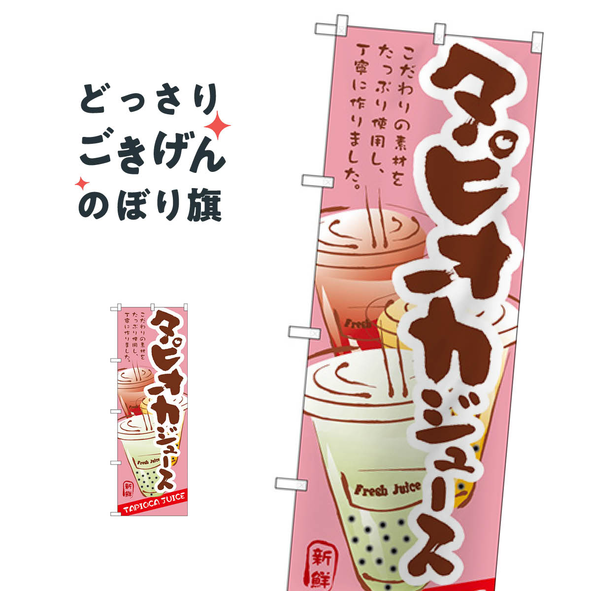 こちらののぼり旗は他メーカーの商品のため納期短縮や各種加工のサービスはご利用できませんので、予めご了承下さい。価格に見合った素晴らしいデザイン、素晴らしい品質ののぼり旗です。・2営業日〜4営業日後の発送です。在庫状況によります。・基本的に4営業日後の発送でご使用の計画をお立て下さい。・お急ぎの場合は、グッズプロ製造(ABCのデザインが選べるのぼり旗)でご相談ください。タピオカジュース のぼり旗 SNB-492...[詳細を見る]