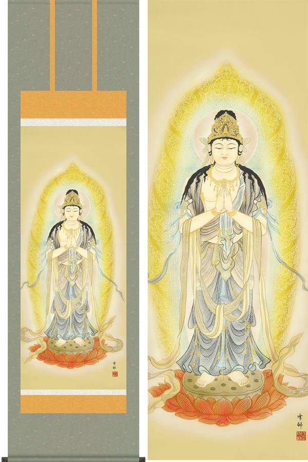 【画 題】聖観音 【解 説】すべての悩める人々を温かい慈悲の心で包み込む観音様が、瑞光の中に浮かび上がる、佛徳あふれる場面を精緻巧妙に描き上げました。 【寸 法】190cm×54.5cm(尺五) 【作 家】中山雪邨 【体 裁】表装:仏表装 本紙:新絹本 【特 典】掛軸小物(風鎮・矢筈)をセットにした、初心者のお客様にも安心のお値打ちサービスです!掛け軸 聖観音 【作品紹介】 すべての悩める人々を温かい慈悲の心で包...[詳細を見る]