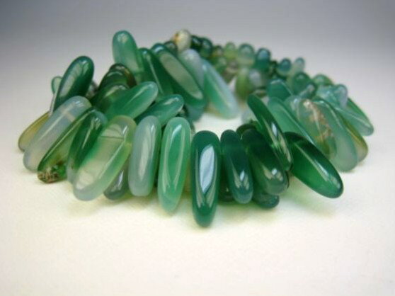 【連売り商品】 グリーンアゲート(緑メノウ) ☆商品情報☆ 縦:約12-22mm 幅:約5-7mm 厚さ:約3-6mm 粒数:約75粒 長さ:約40cm 原産地:ブラジル ※形状やサイズのばらつき、表面や穴周りにキズや凹み等があります。また、割れ欠け、別種の石等が含まれる場合もあります。粒数はあくまで目安です。多少の誤差がありますのでご了承ください。色味や模様等のご指定はできませんのでご了承ください。 ※照明等の関係で実際の色とは多...[詳細を見る]