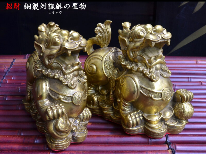 貔貅(ヒキュウ)は、漢の時代以前には翼獣と呼ばれた想像上の動物で、どんな願い事も叶えてくれるという有難い神獣です。財を集める効果に優れ、特に賭け事やギャンブルなどによるお金(偏財)には効果があると言われています。風水を研究していくと最後には貔貅にたどり着くと言われている風水最高の招財アイテムの一つです。本商品は好運を呼び寄せる球と願いを叶える如意を持った招財対貔貅の置物です。オフィスや中華料理...[詳細を見る]