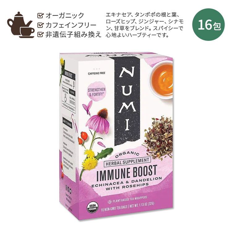 商品説明 ●Numi (ヌミ) は、お茶がもたらす力を世界に広めたいという想いから、1999年にカリフォルニア州オークランドで創業しました。「ヌミ」とはアラビア語で柑橘類を指す言葉。創業者の兄妹二人が幼少期を過ごしたイラクで日常的に飲んでいた、乾燥ライムのお茶にちなんで名付けられました。 ●エキナセア、タンポポの根や葉、ローズヒップ、ジンジャー、シナモン、甘草をブレンドしたハーブティー。 ●季節の変わり目や寒い...[詳細を見る]