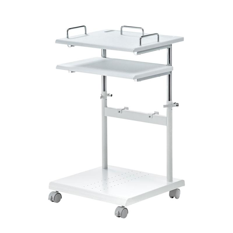 サンワサプライ プロジェクター台 PR-17レバーの開け閉めで、天板の高さを変更することができます天板と中棚の内寸は95mmですが、天板下に丸パイプ(直径22mm)があるため、位置によっては内寸が73mmになります。中棚にプロジェクターを置き、天板に置いたノートパソコンを操作することも可能です。天板を会議テーブルなどにかませて使用できるので、通路を確保できます。未使用時は高さを低くして、プロジェクターを載せたまま...[詳細を見る]