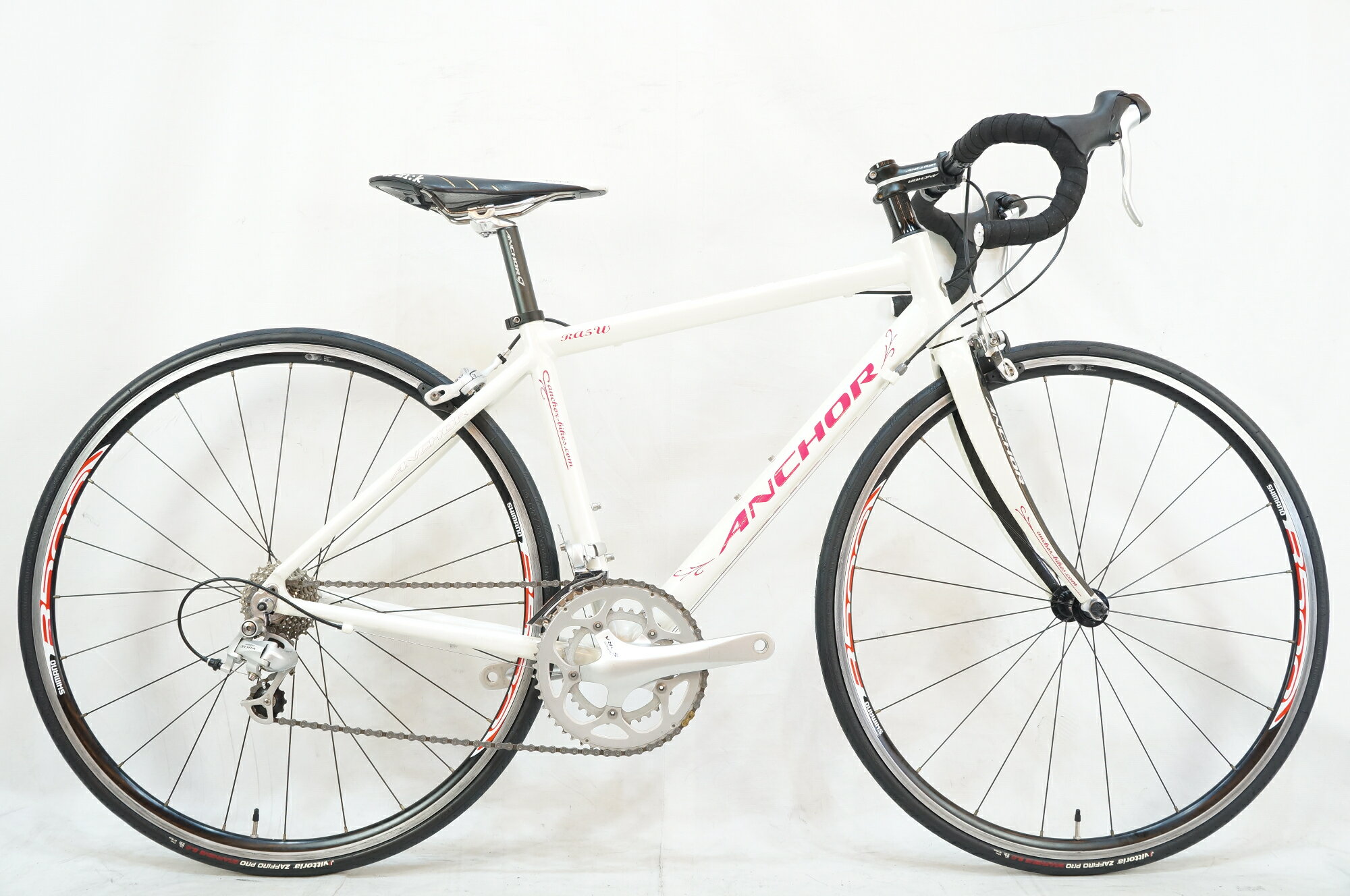 ■商品情報 シートチューブ(C-T): 440mm トップチューブ(C-C):500mm(ホリゾンタル換算) 適応身長:155-165cm(目安) 重量:約9.4kg フレーム材質:アルミ フロントフォーク:カーボン メインコンポ:SHIMANO SORA 3400 クランク:50-34T 165mm スプロケット:13-25T シートポスト:27.2mm ハンドル:400mm ステム:80mm ペダル 付属:なし ホイール:SHIMANO WH-R500 タイヤ:700x25c 変速段数:2x9 付属品:なし ■状態 使用に伴うキズ、ヨゴレ...[詳細を見る]