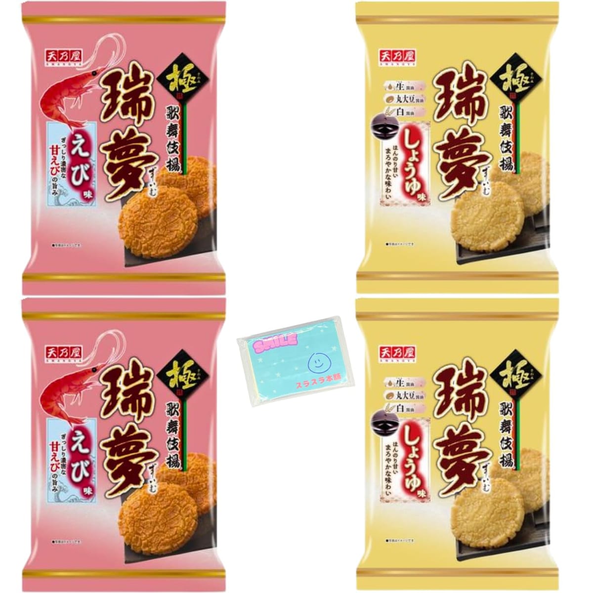天乃屋 歌舞伎揚瑞夢 2種アソートセット 【(1)えび味 6枚 (2)しょうゆ味 7枚 】 各種2袋ずつ 合計4袋セットです。(1)えび味 :お米を細かく丁寧に砕き、独自の製法で花開いた口当たりのよい揚げせんべい。甘えびを練り込んだ、ソフトな生地の揚げせんべいです。 (2)しょうゆ味 :お米を細かく丁寧に砕き、独自の製法で花開いた口当たりのよい揚げせんべい。生しょうゆを使用した、ソフトな生地の揚げせんべいです。アソートだから...[詳細を見る]