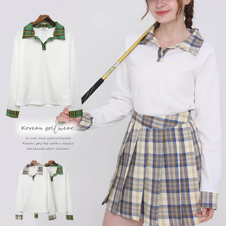 商品番号8398クラシカルなチェック柄の配色で魅せる大人可愛い韓国ゴルフウェアトップス。韓国ならではの洗練された配色センスが光る、長袖ポロtシャツ。襟元と袖口のチェックデザインが、クラシカルで爽やかなアクセントに。身頃はシンプルな無地なので、ボトムスを選ばず幅広く着回せます。春や秋のスポーツシーンはもちろん、普段使いにも取り入れやすいカジュアルデザイン。ゴルフ女子や韓国ファッション好きにおすすめの1...[詳細を見る]