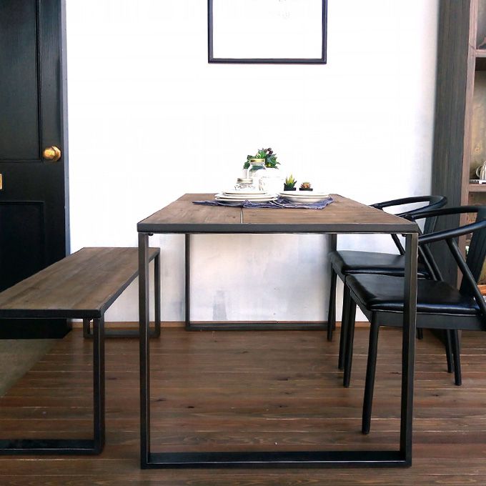 素材 本体:モミ古材・クリア塗装仕上げ 金物:スチール 黒皮風塗装仕上げ サイズ(mm) W1400×D800×H720 特徴 四角いフレームの脚部がシンプルでかっこいいダイニングテーブル! 天板にもスチール枠を使い、板目を交互に切替しており、 シンプルすぎず、飽きのこないデザインです。 天板は古材を使用しフレームも使い込んだ風合いに仕上げており、 脚部が細く見た目以上に圧迫感がありません。 メタルチェアなどと合わせてカッコ...[詳細を見る]