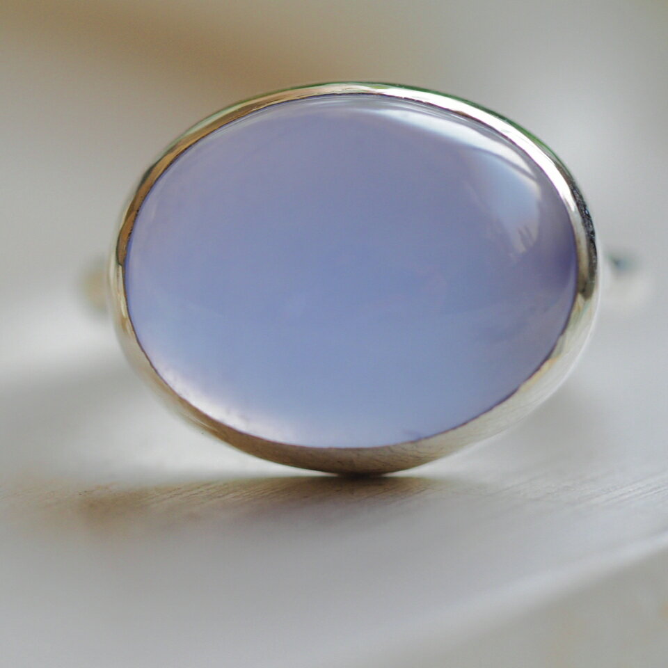 商品情報(特徴など)光を当てると奥底を見透かすようなブルーの色合いは指先でクールな表情をプラスします。石の内部を通過する光は言えないほの明るい青みに心癒されます。素材地金:SV(刻印があります)サイズ*天然ブルーカルセドニーサイズ:約17mm×13mm×7.2mm(厚さ)*リングサイズ:約11.5号~12.5号*リング腕幅:2mm備考カルセドニーは穏やかなエネルギーを持つ好物で、精神をとても優しく癒してくれる石ともいわれ...[詳細を見る]