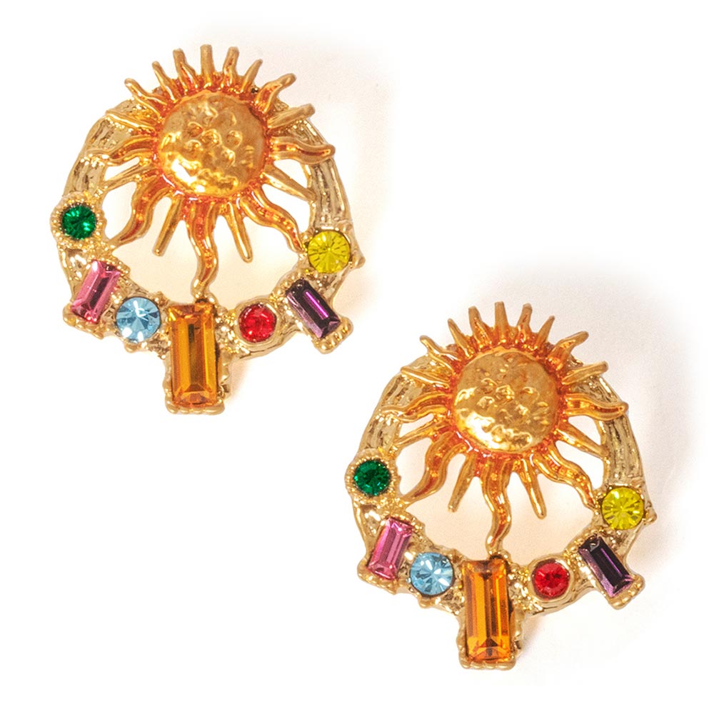 ソル ピアス:Palnart Poc(パルナートポック)太陽から降り注ぐ光をモチーフにしたピアス。鮮やかに彩るカットガラスは、彫金技術がまだ発展していない古代の装飾品をイメージし配置を崩しているのがこだわりのポイントです。カラーバランスと光の輝きを大切に作られた、見る人を惹きつけるアイテムです。カジュアルにもフォーマルにも使える、不思議な存在感をお楽しみください。サイズモチーフ:横2.4×縦2.7cm仕様・素材ピュ...[詳細を見る]