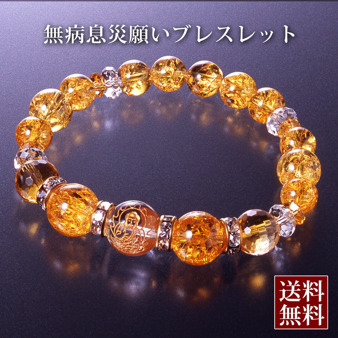 白水晶 1個(12mm珠 薬師如来刻印) 4個(8×4mm/カット) 黄水晶 2個(10mm珠/128面カット)、4個(6×3mm/カット) 爆裂黄水晶 2個(12mm珠)、2個(10mm珠)、9個(8mm珠) ロンデル 4個(8×4mm 真鍮/ラインストーン) [サイズ]約17cm(内周)[重量]約24g [中糸]ポリウレタンゴム [付属品]専用巾着袋、無病・六瓢箪根付ストラップ×1個 [生産国]日本 [個装サイズ]縦15.8×横10.0×高さ3.0(c...[詳細を見る]