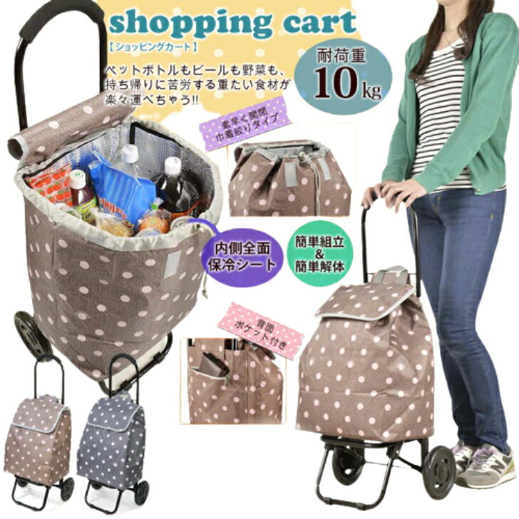 ショッピングカート キャリーケース ドット柄 保冷機能 買い物 スーパー スリム 送料無料 重たい荷物を丸ごと運べる便利なキャリーケース。耐荷重約10kg。持ち運びに苦労するペットボトル、ビール、お米(10kg以内)などがラクラク運べる。 スリムに折り畳めてかさばらない。使わない時は解体してコンパクトに。 ●本体サイズ:【本体】約 幅32x高42x行21(cm)【外寸】約 幅34x高85x行30(cm)●本体重量:【本体】約470g【全体】約1,6...[詳細を見る]
