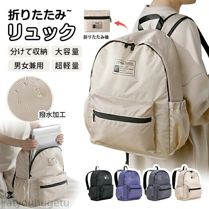 " " 商品内容:折りたたみリュック サイズ:約40×30×13cm ※サイズは規定値です。採寸方法の違いや個体差によって多少の誤差がございますので、予めご了承ください。 カラー:ベージュ、グレー、ブラック、パープル 重さ:【超軽量】 約190g 商品特徴 【折りたたみ】 折りたたんでコンパクトになるので、旅行やお出かけなど持ち運びにも便利です。 【超軽量】 約190gと超軽量デザイン。薄手でかさ張らないので収納の場所もとりま...[詳細を見る]