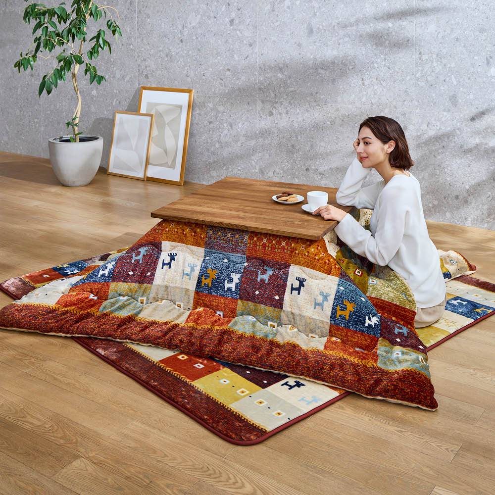 伝統的なギャッベ柄をあしらった、温もりを感じるこたつ掛布団です。木や花、動物など遊牧民の想いが込められたモチーフがリビングに映え、落ち着きのある上質な冬時間を演出します。裏地には、蓄熱・保温性に優れたグラフェン繊維を採用。別売りの同柄ラグとセットで使えば、統一感のある洗練された空間に。やさしい風合いのギャッベ柄で、冬のリビングにぬくもりをギャッベ柄のやさしい趣がリビングに落ち着いた温もりと上質...[詳細を見る]