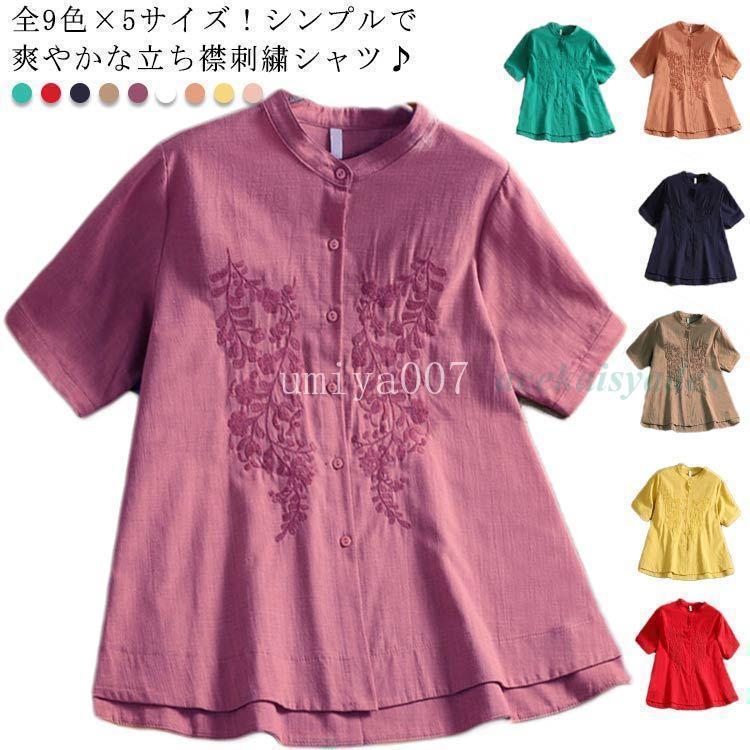 刺繍シャツ ブラウス レディース シャツ トップス 半袖 Tシャツ 前開き 立ち襟 ゆったり 半袖シャツ ふ...