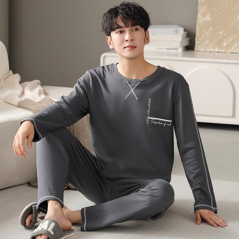 パジャマ メンズ 男性 綿 コットン 丸首 長袖 長ズボン 上下セット 通気性 快適 カジュアル 韓国風 ゆっ...