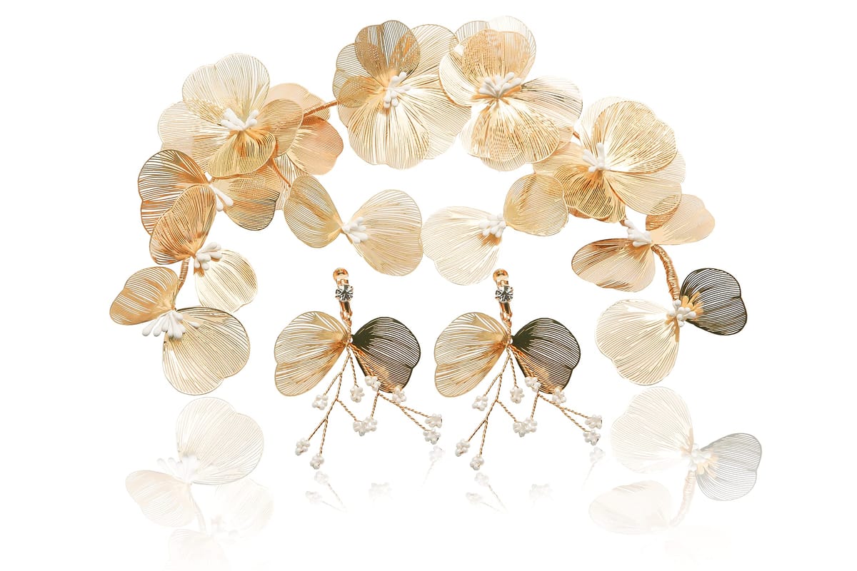 ゴールドのフラワーモチーフのヘッドドレスです。花びらは立体感がありゴージャスで透け感がある大きめな花びらが、とても華やかで写真映えします。自由に曲げたり伸ばしたりできるのでショートやロング問わず、色々なヘヤースタイルに合わすことができます。ヘアピンで固定しますのでお好きな位置にセットできます。ビンテージな印象のゴールドのアクセサリーは結婚式はもちろんガーデンウェディングやパーティー、前撮りやロ...[詳細を見る]