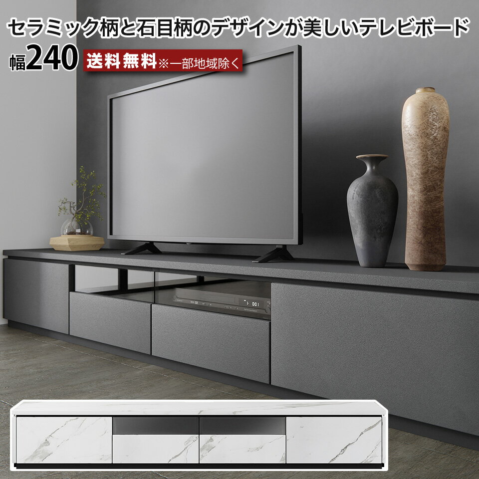 ■商品説明ブラックはセラミック柄、ホワイトは石目柄という2つのデザインが美しい、幅240(239.3cm)のテレビ台です。表面も天板もセラミック柄/石目柄で統一された高級感のあるデザインになっています。4杯の引き出しには奥の物まで取り出しやすい、フルオープンレールを採用。中央2杯の引き出しは、上下2段になっており、上段にはAVデッキが収納できるスペースとして、下段には小物やリモコンなどを収納することができます。...[詳細を見る]