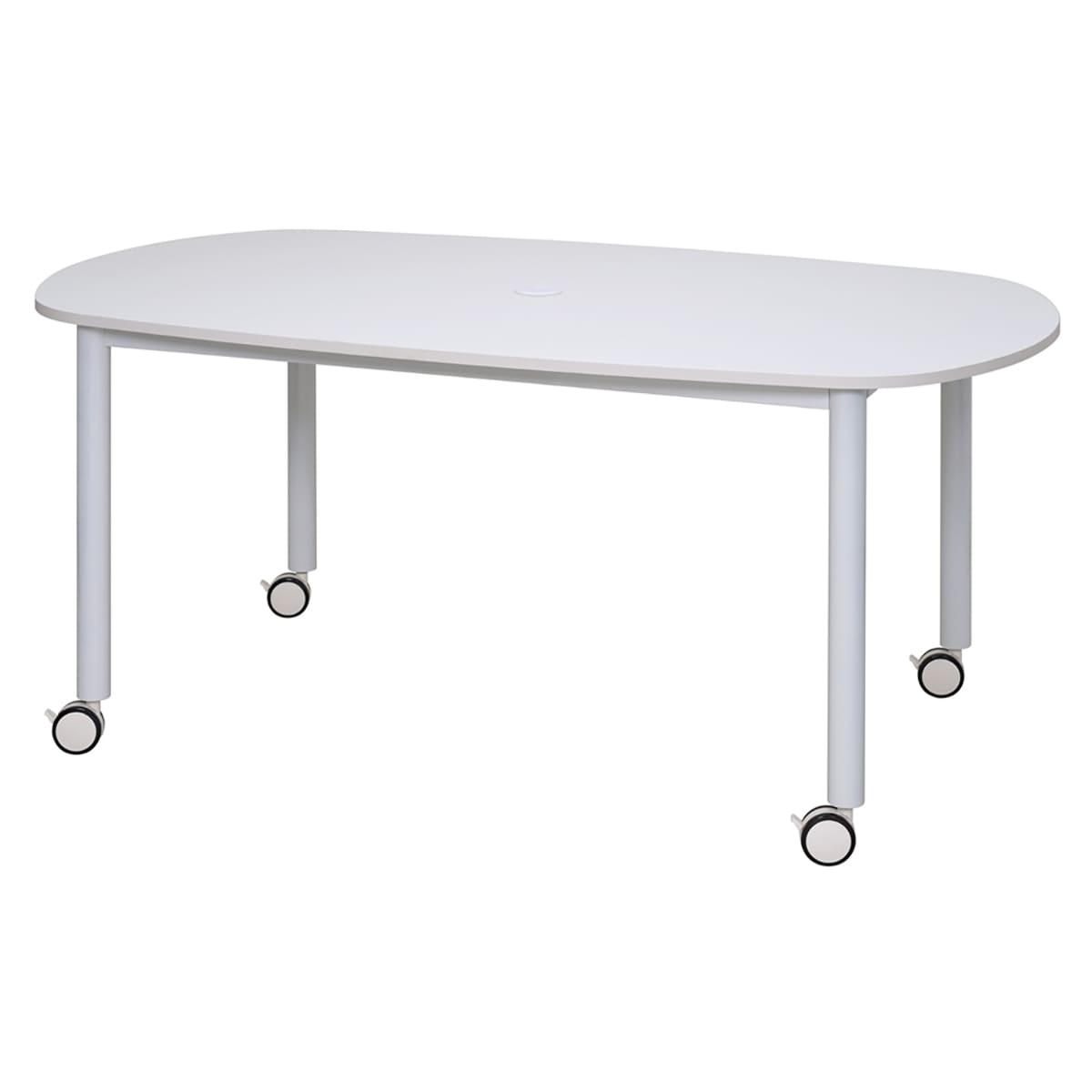 MT-VD159E6AMV5-Eのサイズは、幅1500mm、奥行900mm、高さ720mmです。 天板は1枚で、配線機能はありません。 天板素材はメラミン化粧板、エッジはラウンドエッジ、脚部はT字脚です。 キャスター、収納、幕板、棚は付いていません。 天板形状は楕円形、脚素材はスチールです。[詳細を見る]