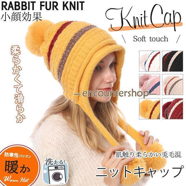 ニット帽 耳あて付き 裏起毛 フェイクファー ポンポン飾り ボーダー柄 かわいい レディース 秋冬 帽子 防寒