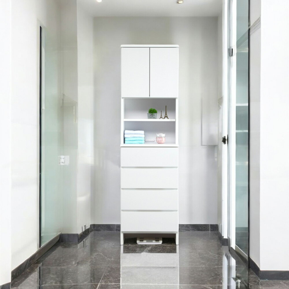 商品情報 材質 表面材:強化紙 側部/内部:プリント化粧繊維板 天板:強化紙 サイズ 幅52.5×奥行35×高さ180cm ◇上部扉内部:幅48×奥行18.6×高さ42(可動棚板1枚付き) ◇オープンスペース:幅48×奥行18.6×高さ42(可動棚板1枚付き) ◇引き出し[1段目]:幅45.3×奥行27.6×高さ14.7 ◇引き出し[2-4段目]:幅45.3×奥行27.6×高さ15.7 ◇下段オープンスペース:幅48×奥行30×高さ10 カラー ホワイト 特徴 ◇清潔感のあるサニタリ...[詳細を見る]