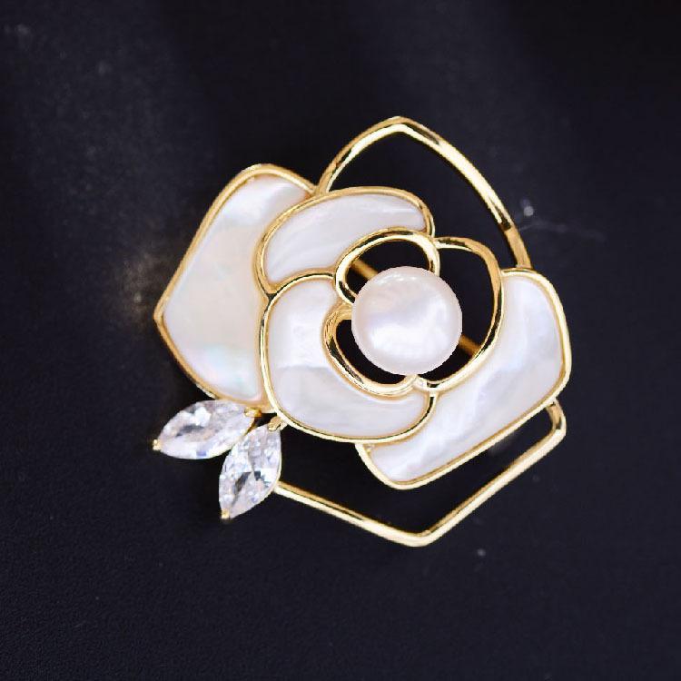 ・種類: ブローチ・素材: 銅、ジルコニア、マザーオブパール・対象: 女性・モチーフ: 花、葉、カメリア・加工方法: 電気メッキ・カラー: ゴールド・機能: 装飾・スタイル: 個性的[詳細を見る]