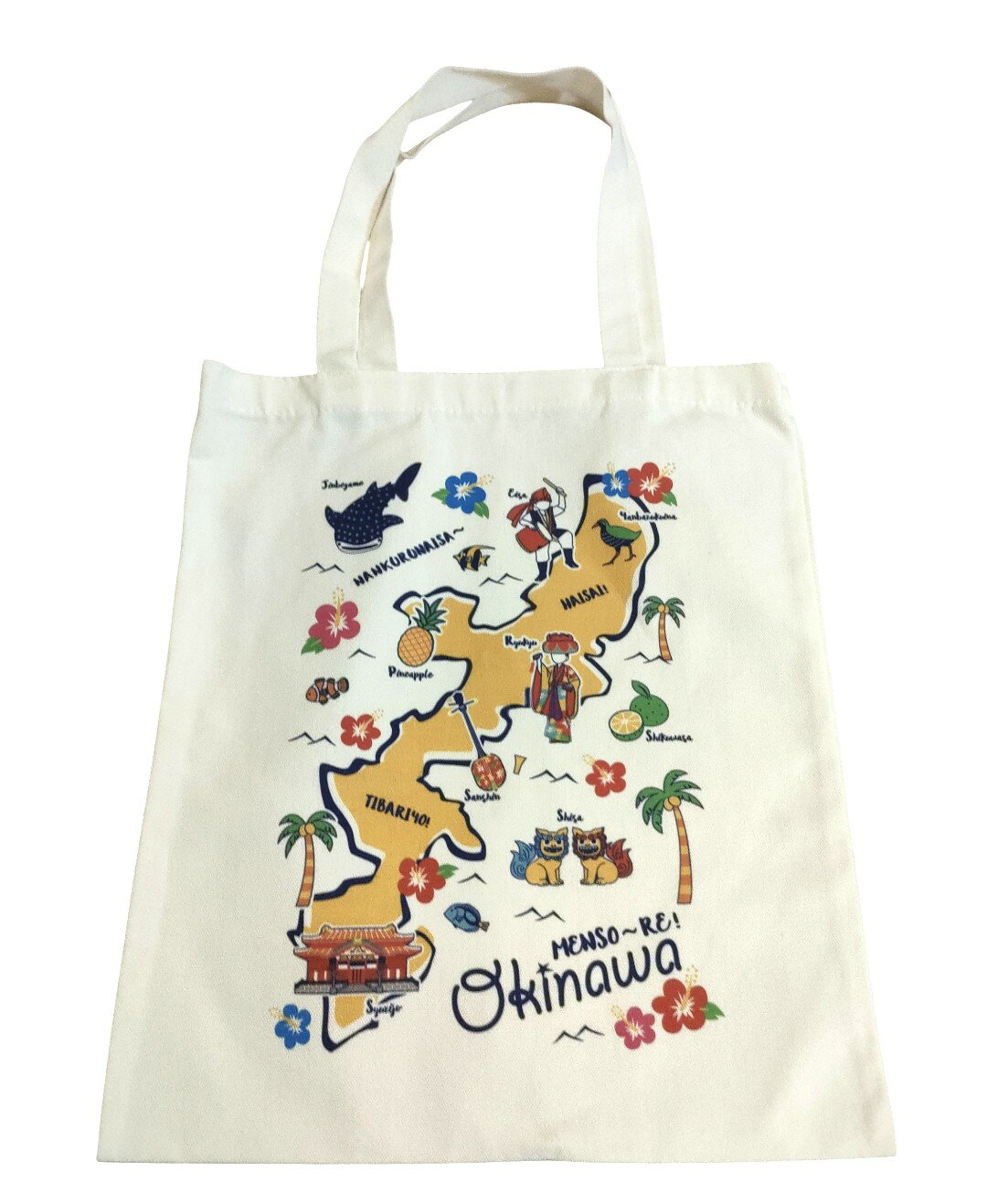 沖縄本島の地図にエイサー・クマノミ・三線・シーサー・ゴーヤー・ジンベイザメ・ヤンバルクイナ・ハイビスカス・パイナップル・シークワーサー・ヤシの木・首里城など沖縄っぽい可愛いデザインと「ハイサイ!」「なんくるさいさ~」「チバリヨー!」「めんそーれ!」など沖縄方言がプリントされた沖縄がギュッと詰まったトードバッグです。 程よい大きさ&丈夫な作りでヘビーユースにも応えてくれそうです! 大きさ:縦約39cm...[詳細を見る]