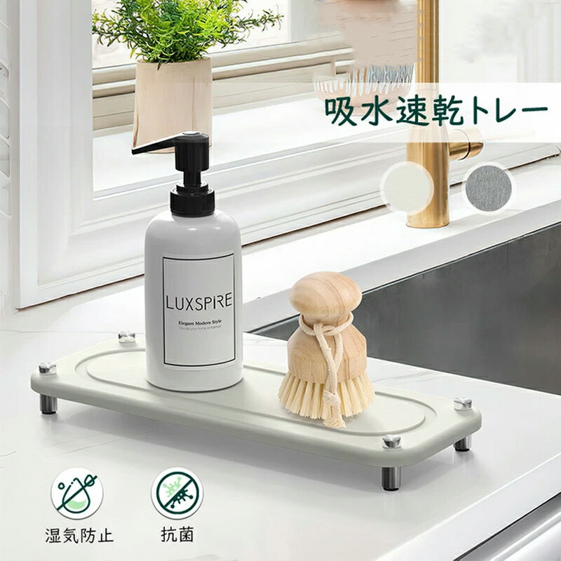 商品説明 商品仕様 「吸水速乾トレー」 吸水性と速乾性に優れている珪藻土/カオリン土を採用し、使ったばっかりの歯磨きコップなどでも水分はすぐに吸収され、通気性がよくて、生乾きの臭いがつきにくく、湿気がこもらずカビの生えも防げます。洗面台やキッチンをいつもきれいに保ちます。 「ステンレススタンド付き」 四隅にステンレス製の脚がありまして、天板から離れて置くことができて、底部に水が溜まったりすることによ...[詳細を見る]