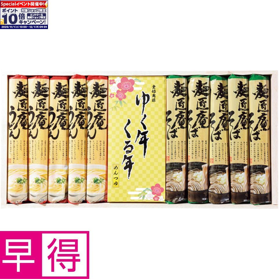 【冬の贈りもの早得】麺匠庵ゆく年くる年[大切な人に贈る、ほっとくつろぐ、とくべつな時間]【早得予約は12/10(水) 15時まで】※早得期間終了後は、本体価格2,400円(税込2,592円)となります。※配送料は、早得割引対象外です。「ゆく年くる年」の名前で人気の冬の定番商品です。そばとうどんの食べくらべをお楽しみください。●商品詳細:年越そば100g×5、年明うどん100g×5、麺つゆ8.5g×10●原料原産地:小麦粉(オーストラリア、...[詳細を見る]