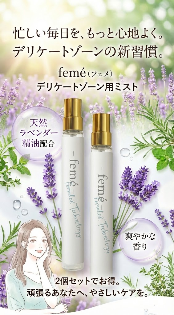 頑張るあなたへ、やさしいケアを。 1本あたり790円!デリケートゾーンの新習慣ミスト。 「日中、ムレやニオイが気になって仕事に集中できない…」 「外出先でも手軽にリフレッシュしたい。」 そんなすべての女性の悩みに寄り添うフェムテックアイテムが、「feme(フェメ)」です。 デリケートゾーンのpH値が乱れると、自浄作用が働きにくくなり、雑菌が増えてニオイやかゆみの原因に。 femeは、お肌と同じ「弱酸性」のミストで、...[詳細を見る]