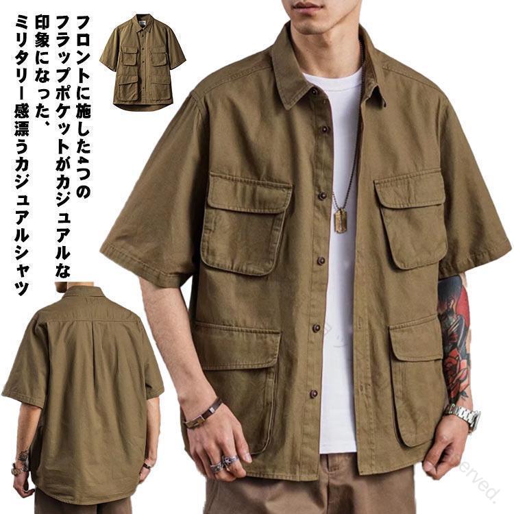 半袖シャツ メンズ M42 ミリタリーシャツ 無地 ツイル生地 カジュアルシャツ フラップポケット 多ポケッ...