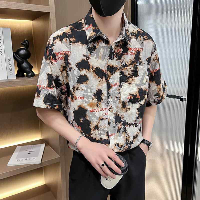 シャツ メンズ 接触冷感 吸汗速乾 薄手 五分袖 韓国ファッション 小花柄 スリムフィット カジュアル リ...