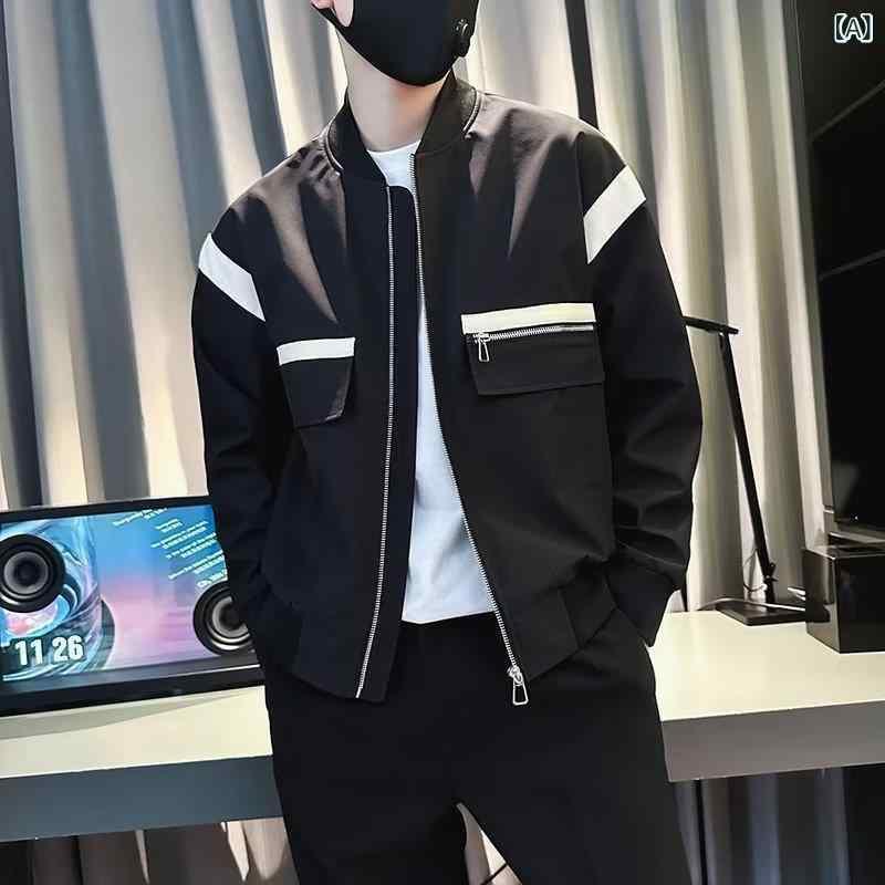 ジャケット メンズ スタンドカラー ブルゾン 春秋 アウター 配色 ストライプ ポリエステル 黒 白 茶色 M...