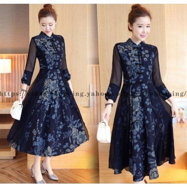ネイビー綿のチャイナドレス ロング 演奏会 パーティードレス 旗袍 チーパオ チャイナ服 服 花柄 aライ...