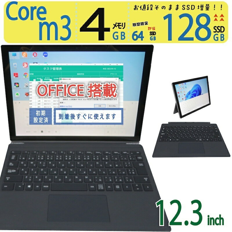 このPCの特徴 メーカー Microsoft 品名/型番 Surface Pro 1796 ディスプレイ 12.3型 2736 × 1824(3K) タッチパネル搭載で直感的に操作出来ます!! CPU 高性能 Intel Core m3 超高速 1.0 GHzのスレッドが駆動します。 大人気Intel製 メモリ 4GB 大容量メモリで複数アプリも操作◎ ストレージ (SSD) 128GB SSD 『爆速 SSD搭載』静かで耐衝撃性に優れ、OSやプログラムなどのソフトの起動速度が大幅に高速化します!! OS Windo...[詳細を見る]