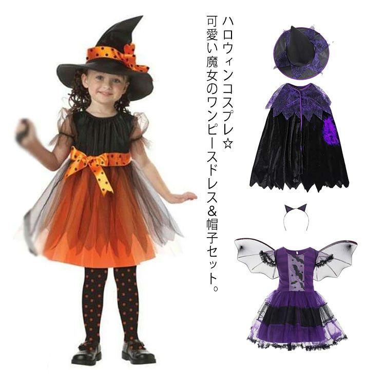 魔女 ハロウィン 衣装 子供 ハロウィン 仮装 小学生 女の子 ワンピース マント 2点セット バット柄 パー...