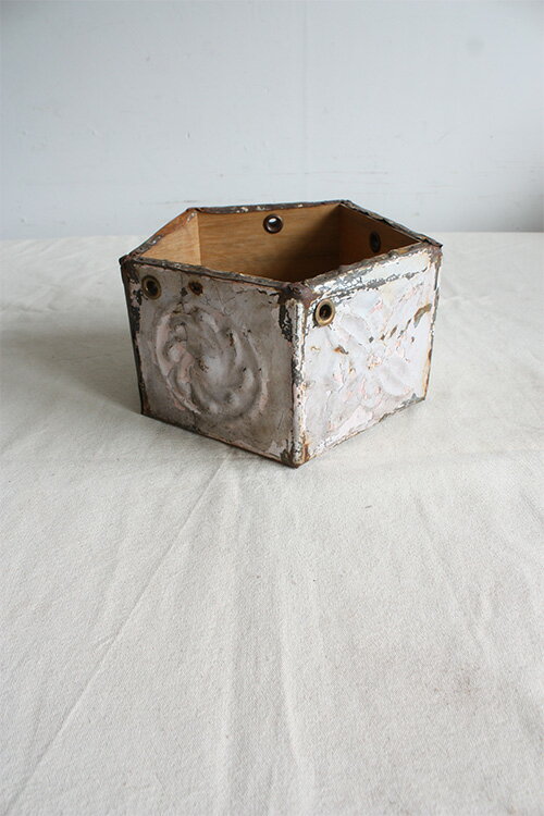 ******************************** ●サイズW245/ D235/ H140 ●原産国 USA ●素材 wood / iron ******************************** 教会の天井材として使用されていた ティンパネルを使用し、製作した オリジナルのボックスです。 1860〜1890年代の当時使用されていたままの 素材を使用しているので、 存在感のある商品となっています。 ヒモやチェーンを取り付けて画像のように鉢植えの カバーとしてもお使い頂けます。 ※写真...[詳細を見る]