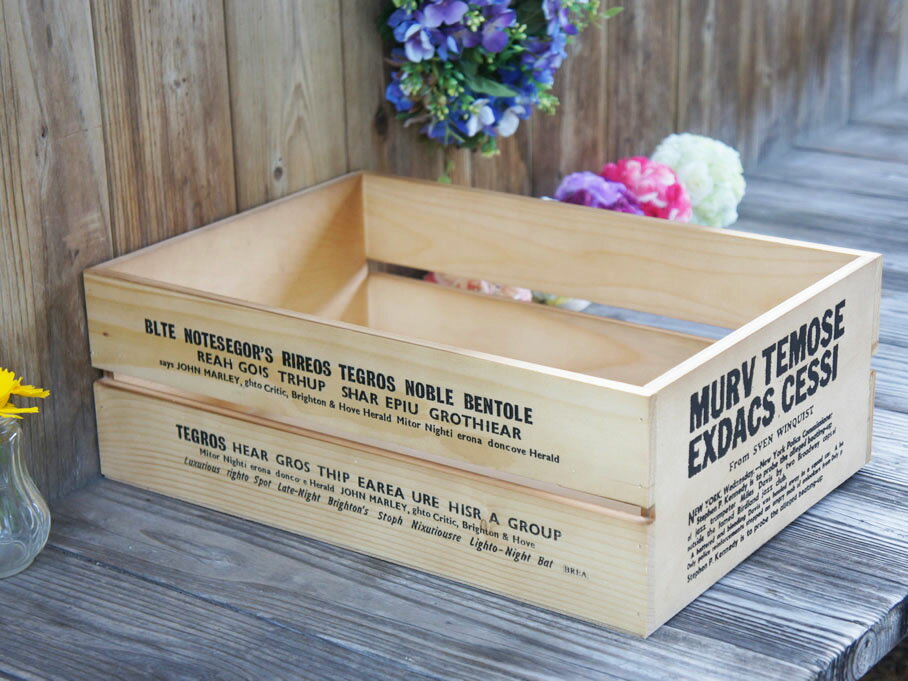 インテリアにもなるお洒落な木箱です。 タオルや衣類の整理に。おもちゃ箱に。 キッチンでの根菜やストック物の収納ボックスとして。 使っても飾ってもステキな木箱をどうぞ。日本製です。 木箱の英字デザインは前後にあります。 横(長い方)の英字デザインは片側のみです。 こちらは大きいサイズ1個でのお届けです。 【サイズ】 幅283×奥410×高143(mm) 【注意事項】 天然素材を使って作られている商品のため 1つ1つ木目の違い...[詳細を見る]