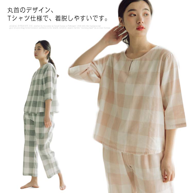 丸首のデザイン、Tシャツ仕様で、着脱しやすいです。オーソドックスなチェック柄。ルームウェア風のデザインで、ちょっとした玄関対応もできます。七分袖の長さは動きやすい、長時間快適に着ていられます。ウエスト部にはゴム仕様で体をしっかりとホールドしてくれますので、適度な伸縮性もあり、楽に過ごせます。パンツの両さいどにポケット付くので便利です。ダブルガーゼは、洗濯するほどにふっくらふわふわに通気性、吸水性...[詳細を見る]
