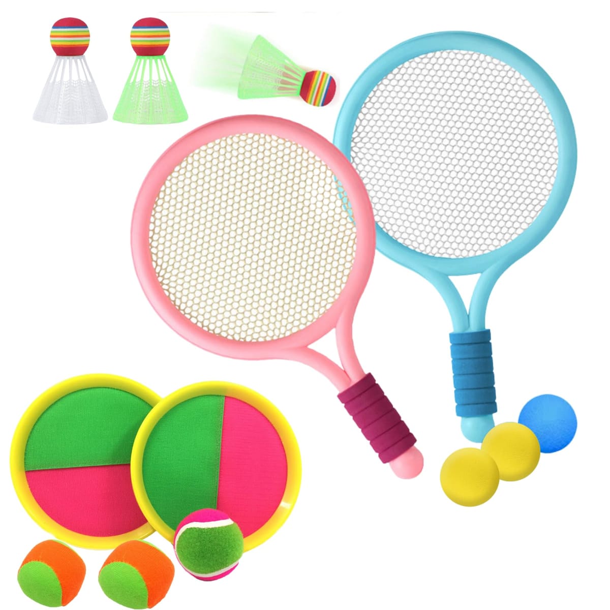 【3種類の遊びセット:バドミントン、テニス、マジックテープ付きキャッチボール】お子様の気分や得意なスタイルに合わせて自由に選べる3種類の遊びが含まれています。【高弾性で飛距離が伸びる】この高弾性のネットは、力のない子どもでも簡単にテニスやバドミントンを楽しむことができます。テニス用ボールとバドミントン用シャトルが各3個ずつ付属しているため、すぐに使用できます。マジックテープ付きキャッチボール:付属...[詳細を見る]