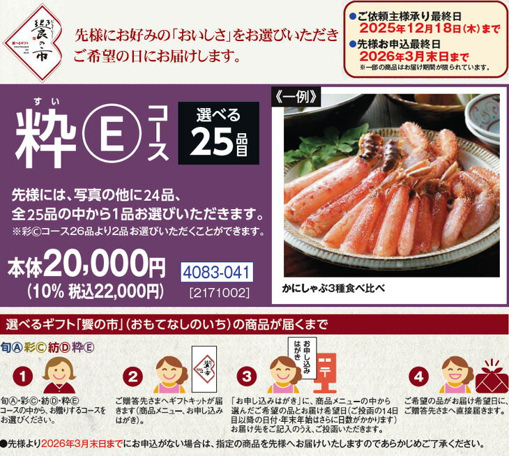 商品内容先様には、写真の他に24品、全25品の中から1品お選びいただけます。※彩Cコース26品より2品お選びいただくことができます。各種アイコンアイコンの説明はこちら【カタログ掲載ページ】はこちら【冬ギフトについてのご案内】はこちらその他特記事項 ※こちらの商品は簡易包装のみの商品になります。先様に直接お届けする前提であり、お品物に簡易包装をして、直接お届け伝票を貼り付けてのお届けとなります。お手持ちさ...[詳細を見る]