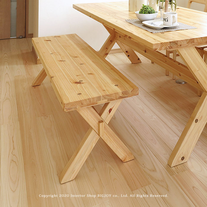 ヒノキ無垢材のダイニングベンチ 国産ヒノキ材を贅沢に使った木の素材感たっぷりなダイニングベンチ(ベンチチェア)。 ヒノキの香りは自律神経を安定させ、集中力を高めカビやダニなどを防ぐ効果があるとされています。 滑らかな触り心地に仕上げており、木に触れることでお子様の感性が豊かに育つとも言われています。 ログハウスなどに置いてもぴったりな個性豊かなX型の脚デザイン。 ヒノキ材特有の節や白太、赤身などが魅...[詳細を見る]