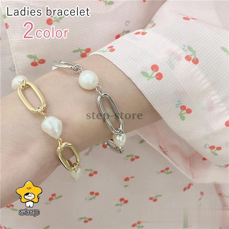 二連チェーンにフェイクパールのついたお洒落なデザイン♪レディース用のブレスレットです。自分用はもちろん、プレゼント用としても◎【サイズについて】画像をご参照ください。【素材について】合金【カラーについて】生産ロットにより柄の出方や色の濃淡が異なる場合がございます。お使いのモニターや撮影時の光の加減などにより画像と実際の商品のカラーが異なる場合もございます。予告なしにカラーやデザインなどの変更があ...[詳細を見る]