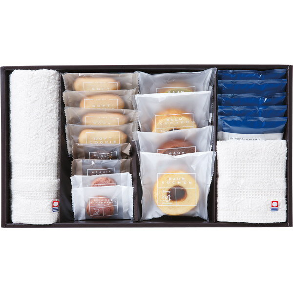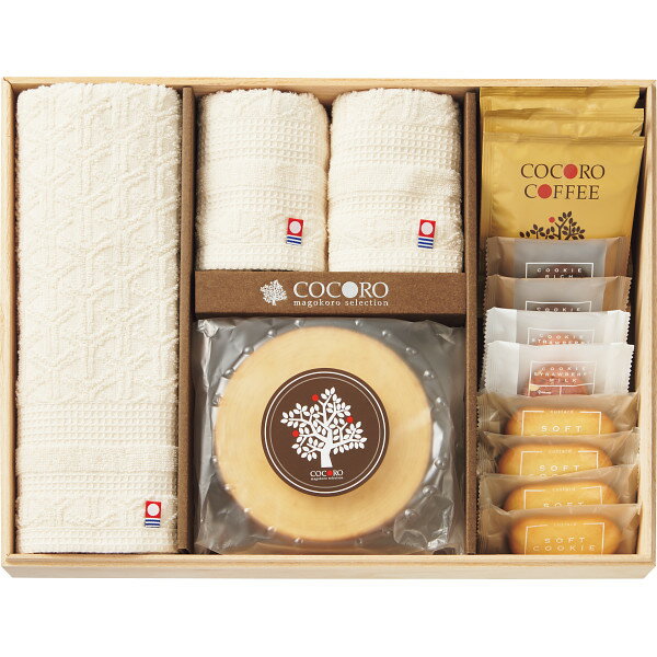 ココロ 今治タオル・バウムクーヘンセット(木箱入)■商品情報■●今治産フェイスタオル(約34×75cm・綿100%・日本製)1枚・今治産ウォッシュタオル(約34×35cm・綿100%・日本製)2枚・バウムクーヘン(北海道産生乳100%の生クリーム使用)(約14φcm)×1・ソフトクッキー×4・クッキー(いちごミルク×2・ココア×2)・ドリップコーヒー8g×3■アレルギー商品情報■卵:あり 乳成分:あり 小麦:あり えび:なし かに:なしそば...[詳細を見る]