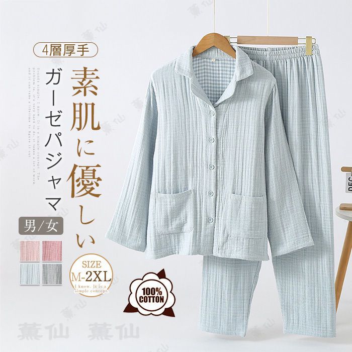 綿 ルームウェア セットアップ レディース メンズ 四層ガーゼ 厚手 暖か 秋 冬 コットン ガーゼパジャマ...